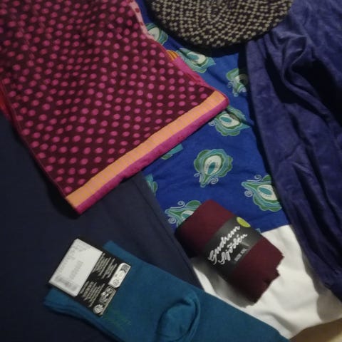 Joulukuun hankintoja kaulahuivi,velourjakku,akirahame,.3paitaa ja baskeri.jersey trikoohousut joissa hintalappiu 69e.postit ,11,90.kaupanpäälle molly jo trikoojakku.xl.