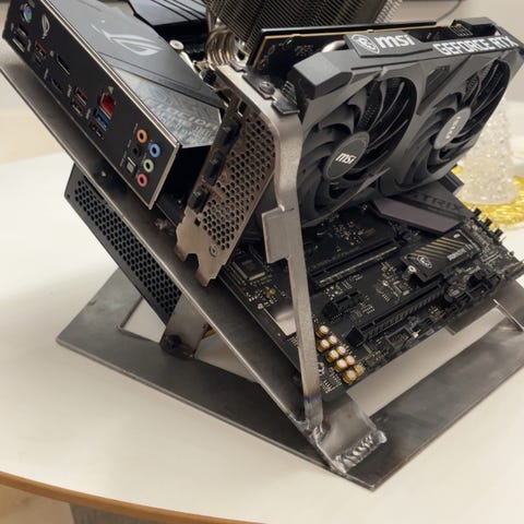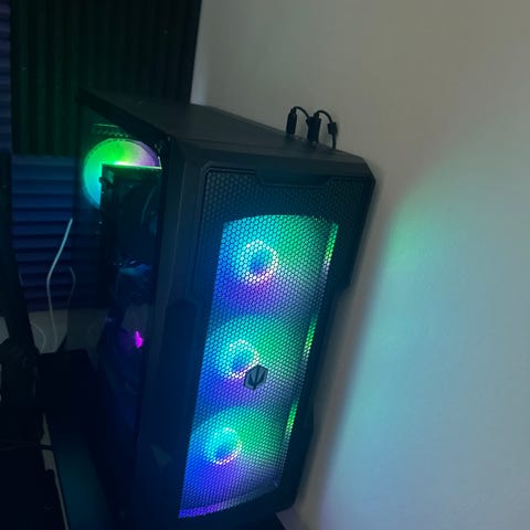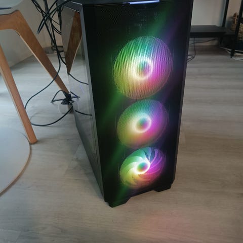 Myydään tehokas Asus-pohjainen pöytätietokone mustassa lasikylkisessä kotelossa.