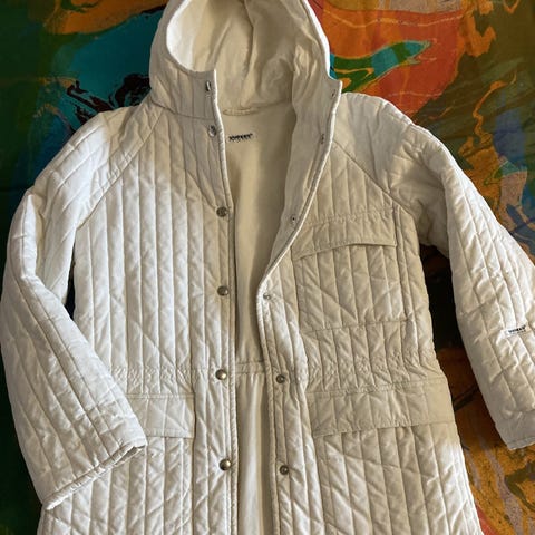 Vuokko pitkä toppatakki. Mustalla pohjalla valkoisia neliöitä. Edessä avotaskut. Pintakangas puuvillaa ja sisällä lämpövanu. Kaulus villaa. Kaksisuuntainen vetoketju. Kokomerkintä XL. Kainalo-kainalo n. 70 cm ja olka-helma n. 130 cm.