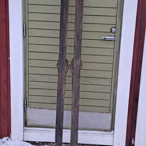 Puusukset/Metsäsukset pituus 215cm, siteet, sauvat. Vanhat kuluneet eränkävijän metsäsukset, 1980-luvulta, Kunto kohtuullinen, hiihtelee vielä muutaman tuhat km. Puusuksi on joustava ja paras umpihankisuksi. Pohjaan suksiterva ja metsään.