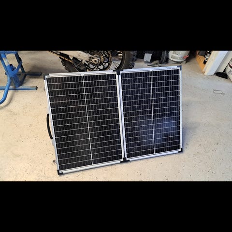 Kuvan kaltainen salkkupaneeli autoon, veneeseen, mökille tms. Meillä paristi mukana kulkenut ja testattu, mutta kiinteä riittänyt meille, joten tarpeettomaksi jäänyt.
