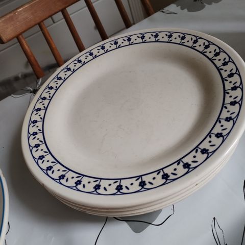 Kaunis muotoilu, luultavasti kiviposliinia, vanhat. Valmistajasta ei varmuutta. Syvät lautaset 7 kpl, halkaisija 21 cm paino 446 g/kpl, matalat lautaset 6 kpl, halkaisija 26 cm paino 768 g/kpl. 1 syvässä ja 1 matalassa lautasessa pienen pieni kolhu. Astianpesukoneen ja mikron kestäviä.