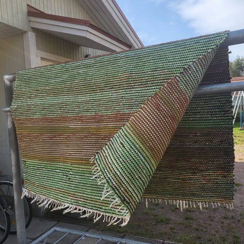 Ehjä, hyvä raidallinen räsymatto. Luonnonvalkoinen pohja. Jokunen haalea tahra löytyy. Ollut pesun jälkeen vain hetken lattialla. Pituus n. 230 cm+hapsut ja leveys n. 115 cm. Sopii monenlaiseen tilaan kotona tai mökillä.