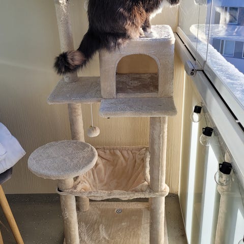 Sisältää köysirakenteita ja sisätilan pienelle kissalle. Materiaalina pehmeä kangas ja raapimapylväät.