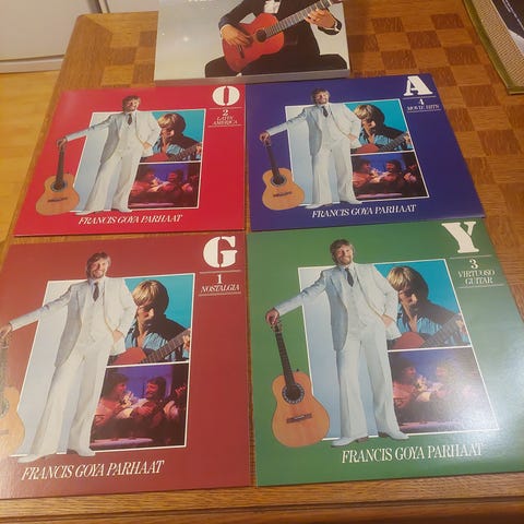 Francis Goya Parhaat on LP-levy, joka sisältää artistin tunnetuimpia kappaleita. Levyn kansi on värillinen ja siinä on kuvia artistista. Tuote on tarkoitettu musiikin kuunteluun.