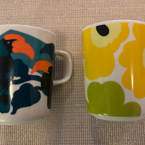 Marimekko Pepe astiaston muki, lautanen ja kulho, joissa on sininen, oranssi ja musta kuviointi. Kaikkia 2 kappaletta. Mieluiten nouto Helsinki.