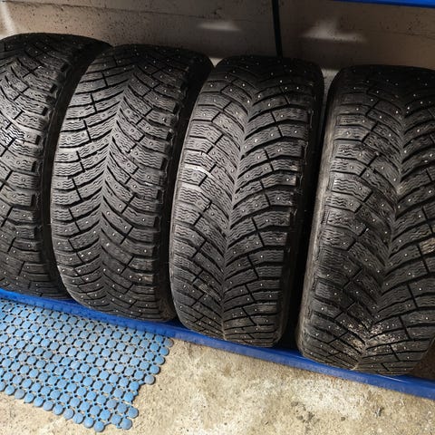 Ylimääräiseksi jääneet Michelin nastarenkaat kitkoihin siirtymisen johdosta. 98% nastoista paikallaan ja pintaa 6mm jäljellä. 36/19 paisto.