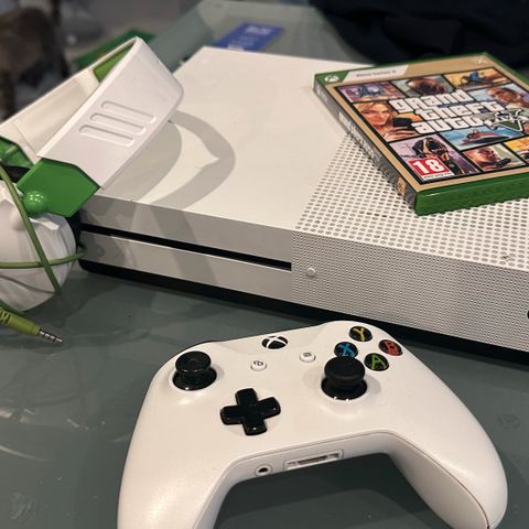 Microsoft Xbox One S pelikonsoli, 1 TB tallennustilalla, valkoinen väri. Mukana kaksi langatonta ohjainta, seinäkiinnike ja Grand Theft Auto V -peli. Mallinumero 1681.