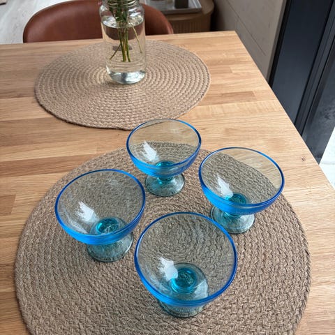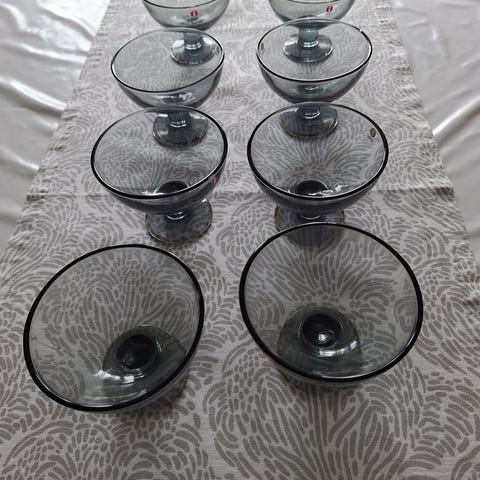 Kotimainen vielä Suomessa valmistetut Iittalan saman sävyn tarjoilukulho Kerttu Nurmisen Verna ja siihen sopivat jälkiruokakulhot Aino Aallon 16 cm, joita 7 kpl.