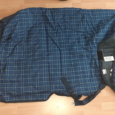 Uusi 250g ulkoloimi, ei edes sovitettu. Meillä vaihtui loimimerkki, kun tarhakaveri repii kaulakappaleet irti ja onnistuu rikkomaan kiinnitykset 😒