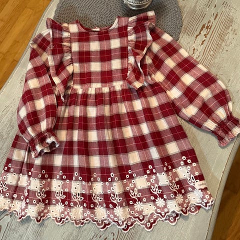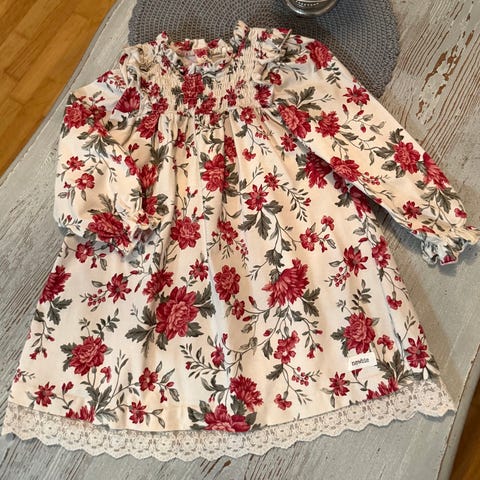 Newbie: Kukkakuvioinen mekko kokoa 98 cm. Erittäin hyväkuntoinen. Aavistus tummalle kuosille tyypillistä pesuhaitua, joka ei erotu käytössä.