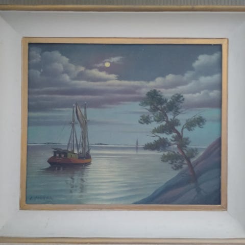 Öljymaalaus, jossa näkyy purjeveneitä ja kaupungin siluetti. Maalauksen koko on noin 48 cm x 50 cm. Värit ovat pääosin vaaleanpunaisen ja violetin sävyisiä.