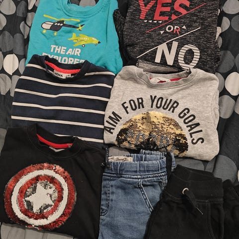 Kahdet housut 92cm, yhdet 90cm, paita 86cm. Paljon käytettyjä, joten käyttö näkyy näissä, mutta edelleen ok kuntoisia käyttövaatteita.