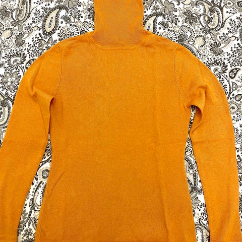 Andiata neulepusero naisille, koko S, oranssin värinen. Valmistettu kashmir / silkki materiaalista. Neulepuserossa on vyötäröllä solmittava nauha.
