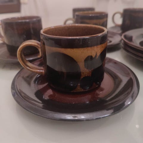 Myydään musta astiasto, sis. 4kpl pienet syvät kipot, 5kpl kahvikuppi, 5kpl kahvikuppilaitaset, 1kpl syvä tarjoiluastia, 1kpl "Juustolautanen", 2kpl pieni syvä lautanen ja 6kpl isoja lautasia. 1kpl musta kahvikuppi(jossa teksti coffee) kaupanpäälle.