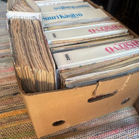 Helmi Vuorelma Oy käsityökuvasto vuodelta 1984. Mallikuvia mm kuultokudos, verhot, ristipistotyöt, kappa, alikaatio, sängynpeite, ryijy koristetyyny, keinutuolimatto, seinävaate. matkahuopa, neule.