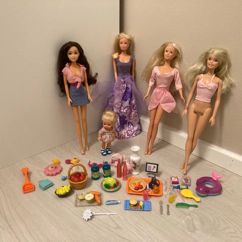 Tästä jokaisen pikkutytön unelma! Iso kasa Barbien tavaroita, kalusteita, nukkeja, vaatteita ja asusteita (kenkiä, laukkuja ym) ym. Kuvissa näkyy avattava koti ja lastenhuoneeksi sopiva babyborn-mininuken koti. Osa tavaroista 80-luvulta, osa uudempia. Osassa muoviosia saattaa olla murtumaa ja puuttuu joitakin osia (isosta matkavaunusta puuttuu osia ja joitakin muoviosia rikki, mutta saa irti ja avattua leirintäkuntoon vielä aivan hyvin), kulumat eivät siis estä leikkejä. Näitä on rakastettu ja leikitty äidin ja tyttärien voimin, nyt aika luopua seuraavalle leikkijälle. Barbie-nukkeja parisenkymmentä ja osa muitakin nukkeja, osan tukkia on saatettu vähän leikellä kampaamoleikeissä, mutta ostaja saa itse valita mitä haluaa säästää. Kaikilla nukeilla kuitenkin jalat ja kädet. Neljän pahvilaatikollisen verran tavaraa, joten mieluiten nouto, mutta toki voin postittaa monessa erässäkin (ostaja maksaa postikulut).