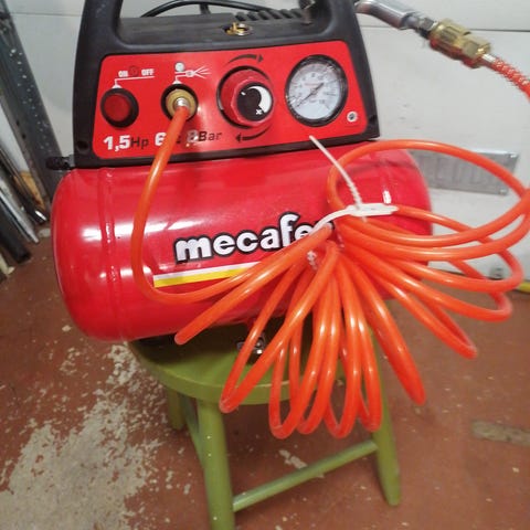 Mecafer Wood Master Kit ilmakompressori, jossa 6 litran säiliö. Moottorin teho 1,1 kW ja 1,5 hevosvoimaa (HP). Sopii 220/240 V jännitteelle. Maksimipaine 8 bar.