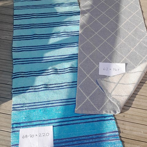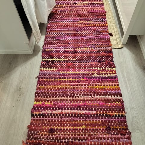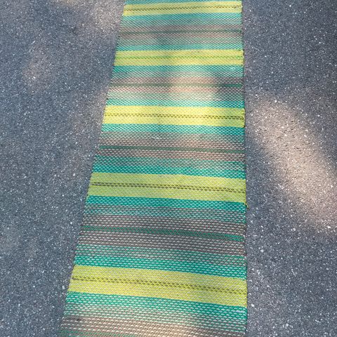 Vihreä oranssi räsymatto. Puhdas ja hyväkuntoinen. Väri on enemmän vihreä voittoinen.