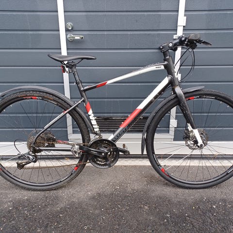 Hybridipyörä kaupunki- ja työmatkapyöräilyyn. Kevyt, jäykkä alumiinirunko, jäykkä haarukka, 16 Shimano-vaihdetta ja hydrauliset levyjarrut. Mukava ajoasento. Paino: 12,9 kg.