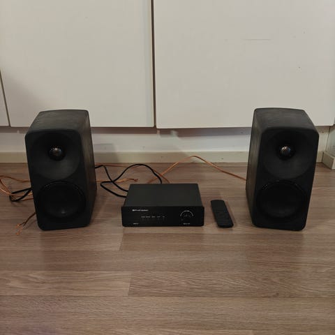 Aurelia Aniara kaiuttimet ja Denon DRA-N5 vahvistin. Mukaan kaiutinjohdot vahvistimen ja kaiuttimien välille.