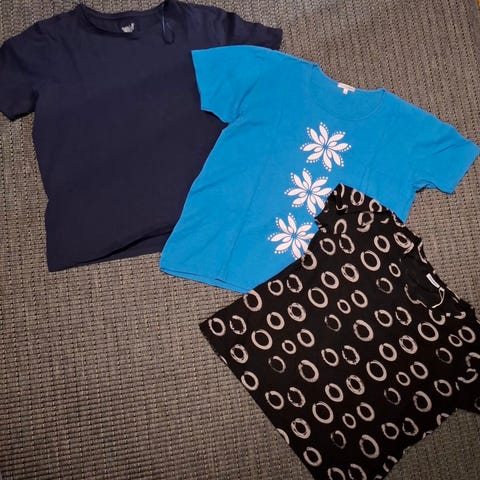 L-kokoisia paitoja setti, raidallinen mustavalkoinen t-paita Lindex, sininen pitkähihainen Finnwear ja musta t-paita Emma. Kannattaa katsoa myös muut ilmoitukseni ja ostaa samoilla postikuluilla 👍