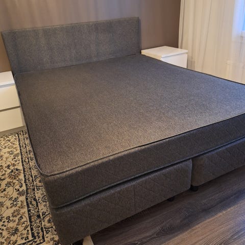 Tumman harmaa Ikean 160cm leveä sänky ja sängynpääty. Sängynpäädyn korkeus 132 cm. Uudet ikean valevåg kiinteät patjat muuten sänky jo 8 vuotta vanha. Muuten ehjä ja siisti vähän kulumaa alareunassa josta kuva.