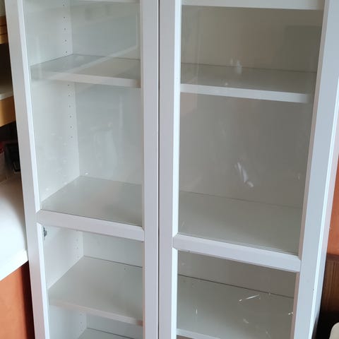 Ihan hyväkuntoinen Billy kirjahylly lasiovilla, joihin on vaihdettu nupit. Hyllyssä on 4 kpl lasihyllyjä sekä katossa 2 spottivaloa, joita ei ole kytketty käyttöön.