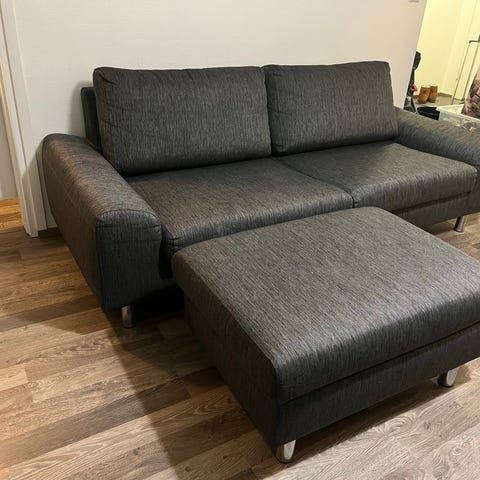 Laadukas tummanhrmaa kangaspintainen mekanismisohva. Reclainer-istuinosa kummassakin sivussa. Manuaalinen avauskahva kunnassakin päässä.