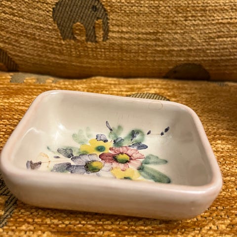 Hyväkuntoinen Arabian kippo, johon joku tuntematon taiteilija on kokeillut taitojaan. Kipon halkaisija on 9cm.