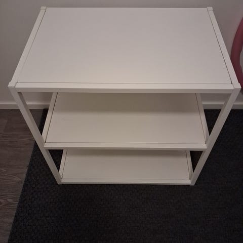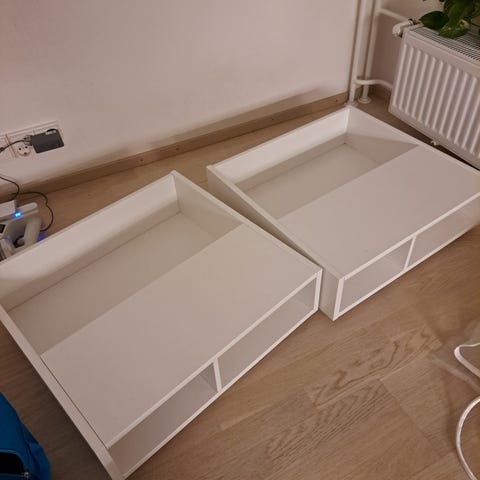 Kaksi Ikea Platsa -hyllyä. Leveys 160 cm molemmat palat yhdessä. Mukaan klipsit joilla voi kiinnittää toisiinsa. Olleet käytössä kukkapöytänä, mistä tullut kanteen pieniä jälkiä.