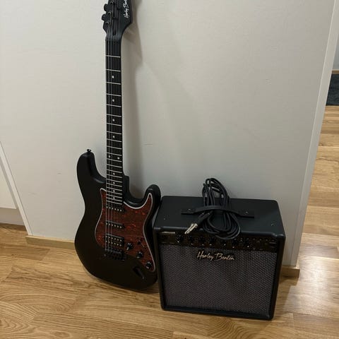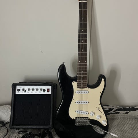 Musta sähkökitarapaketti, joka sisältää sähkökitaran ja vahvistimen. Kitara on varustettu useilla säätimillä ja liitännöillä. Sopii sähkökitaran soittamiseen ja harjoitteluun.