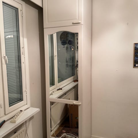 Tarpeettomaksi jäänyt vaatekaappi. Päälisin puolin siistissä kunnossa. Ei mahdu kokonaisena ulos eli joutuu purkamaan pienempiin osiin. Lienee Jyskistä aikoinaan hankittu.