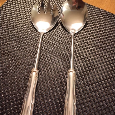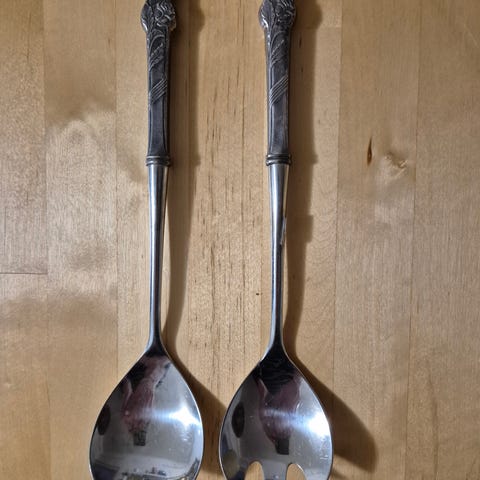 Kultakeskuksen hopeiset salaattiottimet.