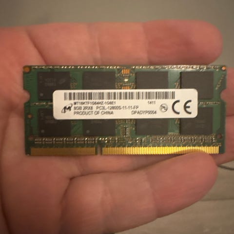 Micron 8GB DDR3 PC3L-12800S RAM-muisti, 8 gigatavua tallennuskapasiteettia, matalajännitteinen (PC3L) muisti, sopii kannettaviin tietokoneisiin. Valmistettu Kiinassa.