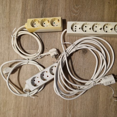 Myydään 6-pistokkeinen 3-metrinen valkoinen jatkojohto virtakatkaisimella ja kaksi vanhanmallista pistorasian haaroitinta kahdella pistokkeella.