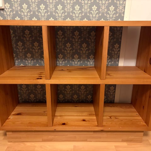Puusepän tekemä, yli kolmekymmentä vuotta vanha lautashylly.