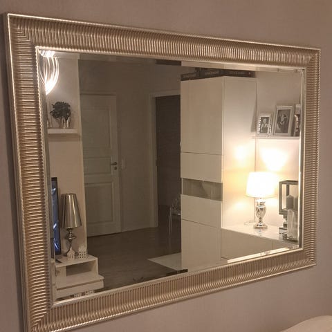 IKEA peili, valkoinen runko ja jalusta. Peilin takana koukkuja, jotka mahdollistavat esimerkiksi vaatteiden ripustamisen. Suunniteltu seisomaan itsenäisesti. Yksi pieni huomaamaton naarmu.