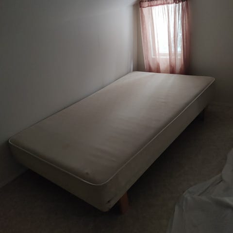 IKEA SKÅRER sänky, vaaleanharmaa kangaspäällyste, puujalat. Lisäksi sotkan n. 10cm paksu petari ja sen suojus josta en muista mallia :)