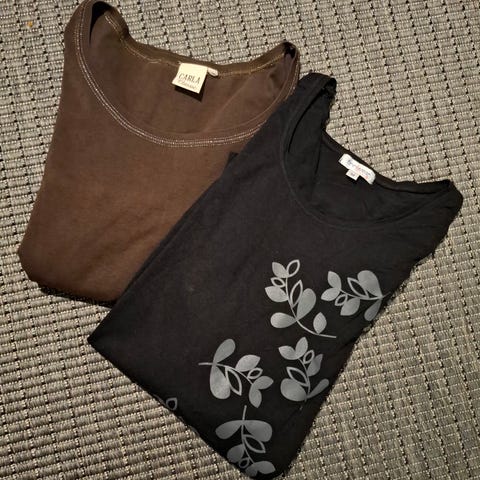 Finnwearin pusero kokoa M, hame Lindexiltä kokoa L, mutta mielestäni pienehköä kokoa. Molemmat kylläkin joustavaa materiaalia. Nätti kokonaisuus. Kannattaa katsoa myös muut ilmoitukseni ja ostaa samoilla postikuluilla.