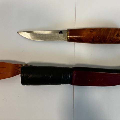 Myydään kuvien mukainen Tommi laadukkaalla Laurin metallin tekemällä terällä. Terän pituus 92mm . Puukon kokonaismitta 200mm. Tuppi ja puukko muuten oma valmiste. Kahva raidanjuuripahkaa ja käsitelty Danish oililla.