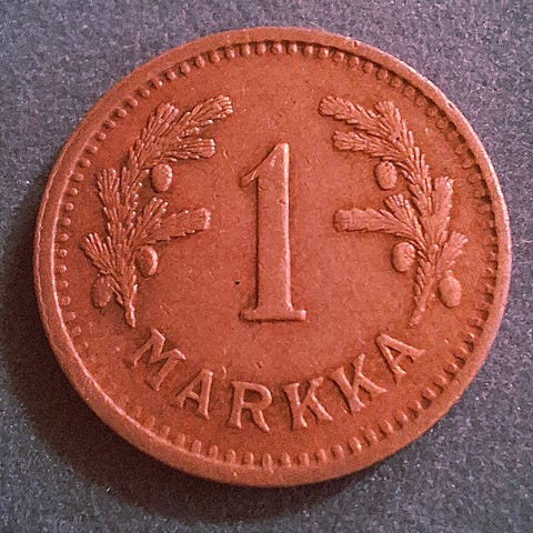 Hyväkuntoinen vuoden 1932 Suomen markka. Paino 4g.