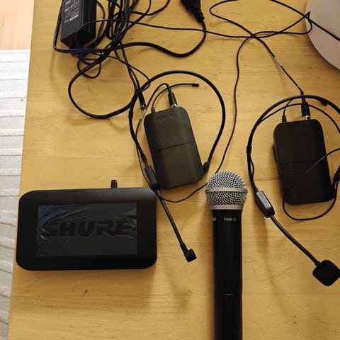 Shure wireless headset. Langaton mikki ja lähetin sekä vastaanotin.