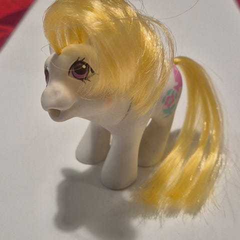 Myynnissä settinä my little pony Baby Tiddly Winks G1 (1985) ja tuttipullo. Ponissa leikkimisen jälkiä. Toisen puolen symbolista vähän kulumaa.