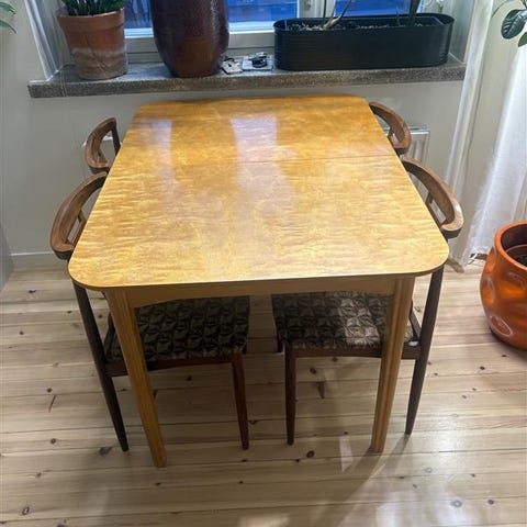 Puinen vintage ruokapöytä, jossa lisäosa, jonka avulla pöydän saa pidemmäksi. Jatkettuna pöydän pituus 150cm. Helppo käyttöinen. Vain nouto.