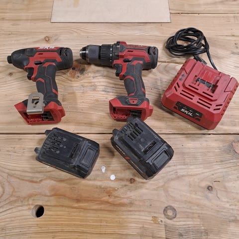 Vähän käytetty pulttipyssy ja voimaa on 2ah akullakin.