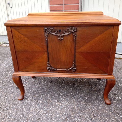 Lipaston taso on koivua, joka petsattu tumman väriseksi. Samoten jalat samaa koivua, nyt petsattuna. Eli halutessaan saa myös vaalena puun ilmeen lipastoon.