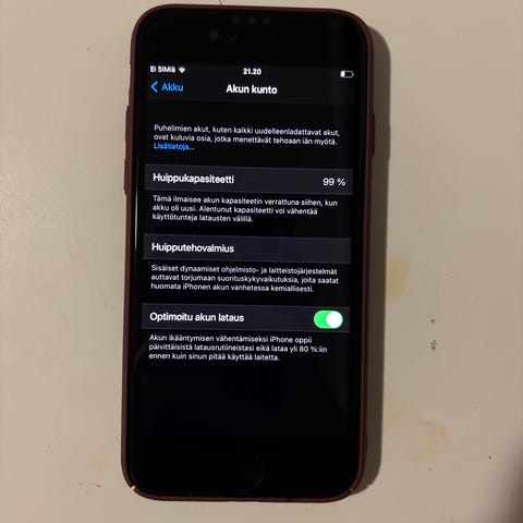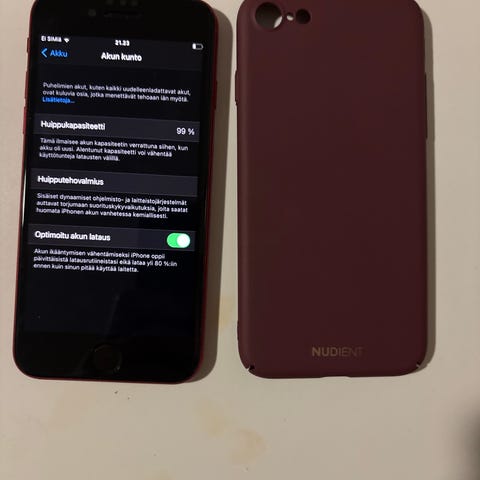 Apple iPhone SE (2-3 gen) älypuhelin, jossa 64 GB tallennustilaa. Puhelin on punainen ja sopii yleiskäyttöön mobiiliviestintään ja sovellusten käyttöön. Huippukapasitanssi on 99% Panssarilasi löytyy myös.