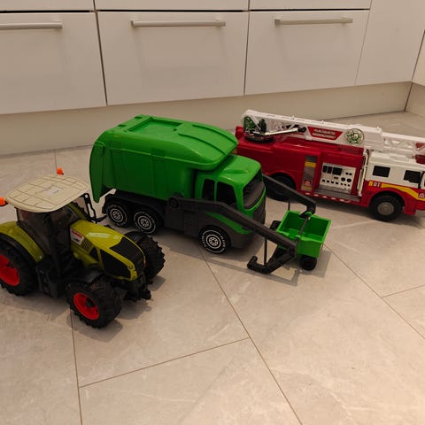 Bruder Claas traktori, Plaston roska-auto ja iso paloauto muovia