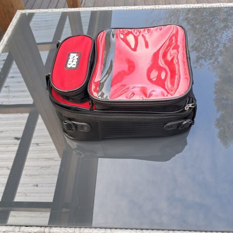Myydään kuvan magneettikiinnitteinen moottoropyörälaukku tankkiin.